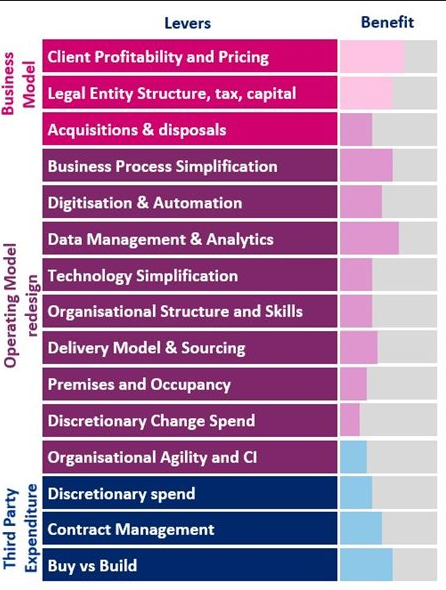 - Streamline the operating model by focusing on levers that target the simplification of processes and technology to drive down costs. This includes adapting how you use existing technologies to create automated processes, optimising workforce strategies, and using data analytics to prioritise and remediate cost challenges