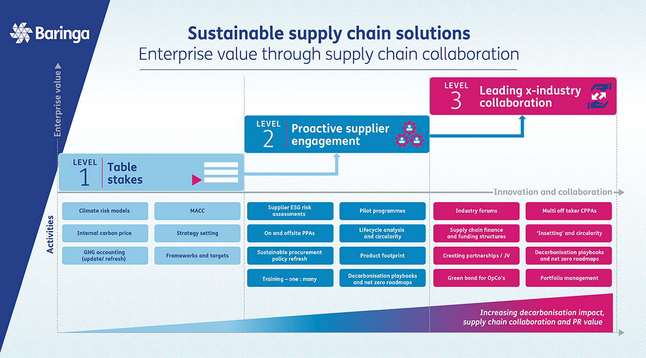 Focusing in on supply chain solutions for decarbonisation means moving from table stakes (Level 1) to proactive supplier engagement (Level 2) and leading in x-industry collaboration (Level 3) as illustrated below.