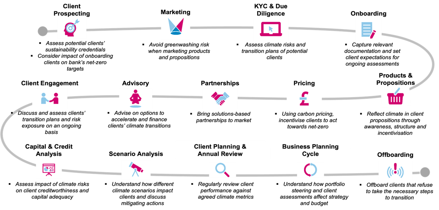 For banks to reinforce this evolved operating model and fully realise their net zero ambitions, climate will need to become a part of everyone’s business as usual – not just the charge of specialised teams. To bring this to life, we can look at how roles and responsibilities would change across a typical client lifecycle, as mapped out in the image below.