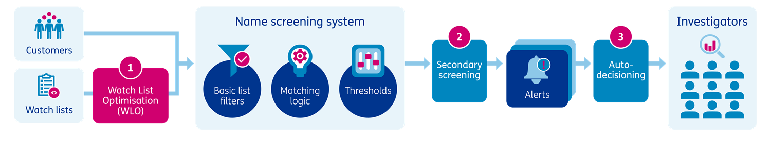 | Low integration effort as it does not require changes to the watch list configuration or name screening systems | |