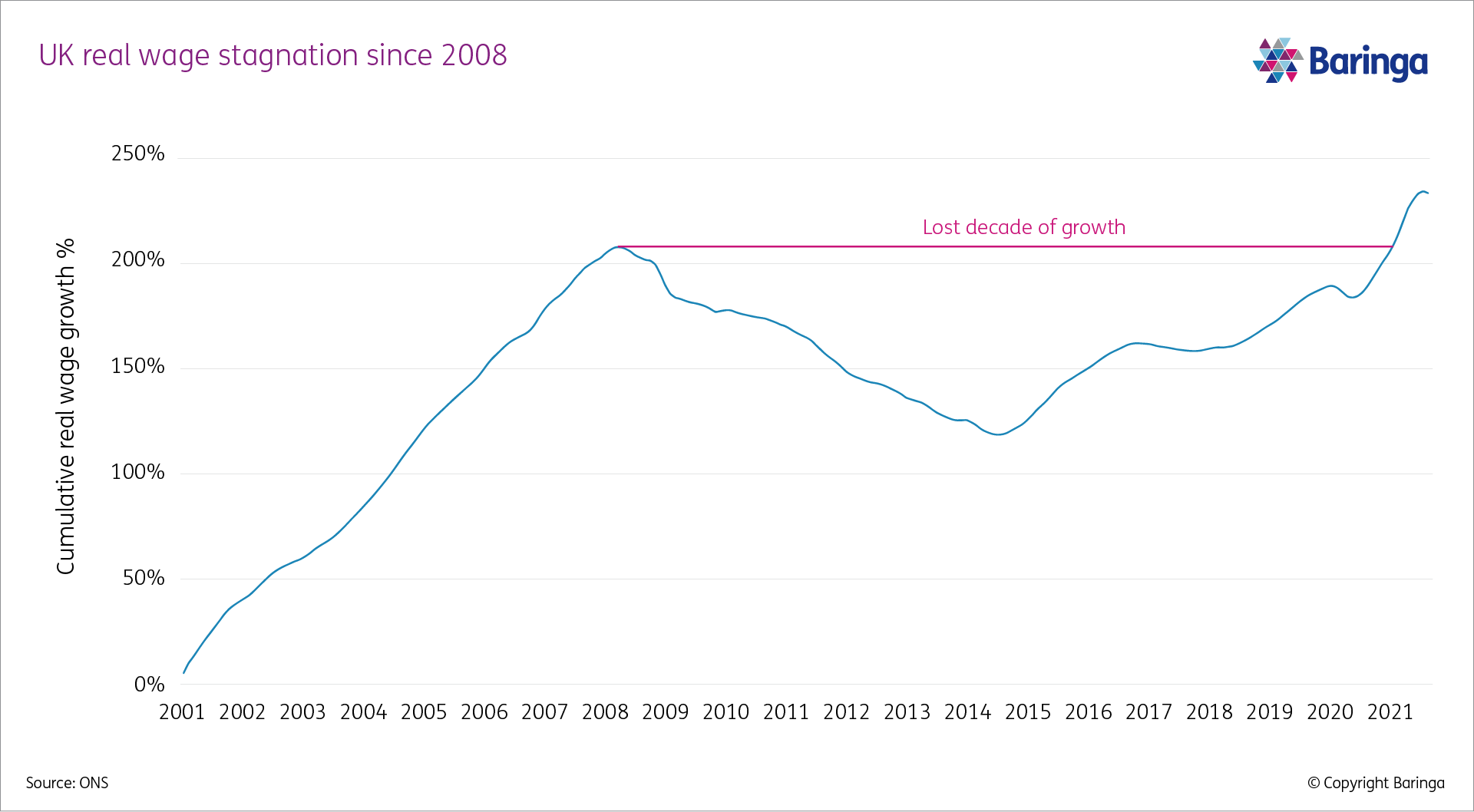 The long shadow of 2008 has had painful implications for UK wages. The UK has experienced a “lost decade” of real wage growth, as productivity collapsed after the global financial crisis (see Fig. 3). Wages remained below 2007 levels right up until 2020. The major contributors to GDP growth since 2008 have been a combination of a larger workforce and rising asset values as opposed to productivity growth; ultimately hindering wage growth for UK households.