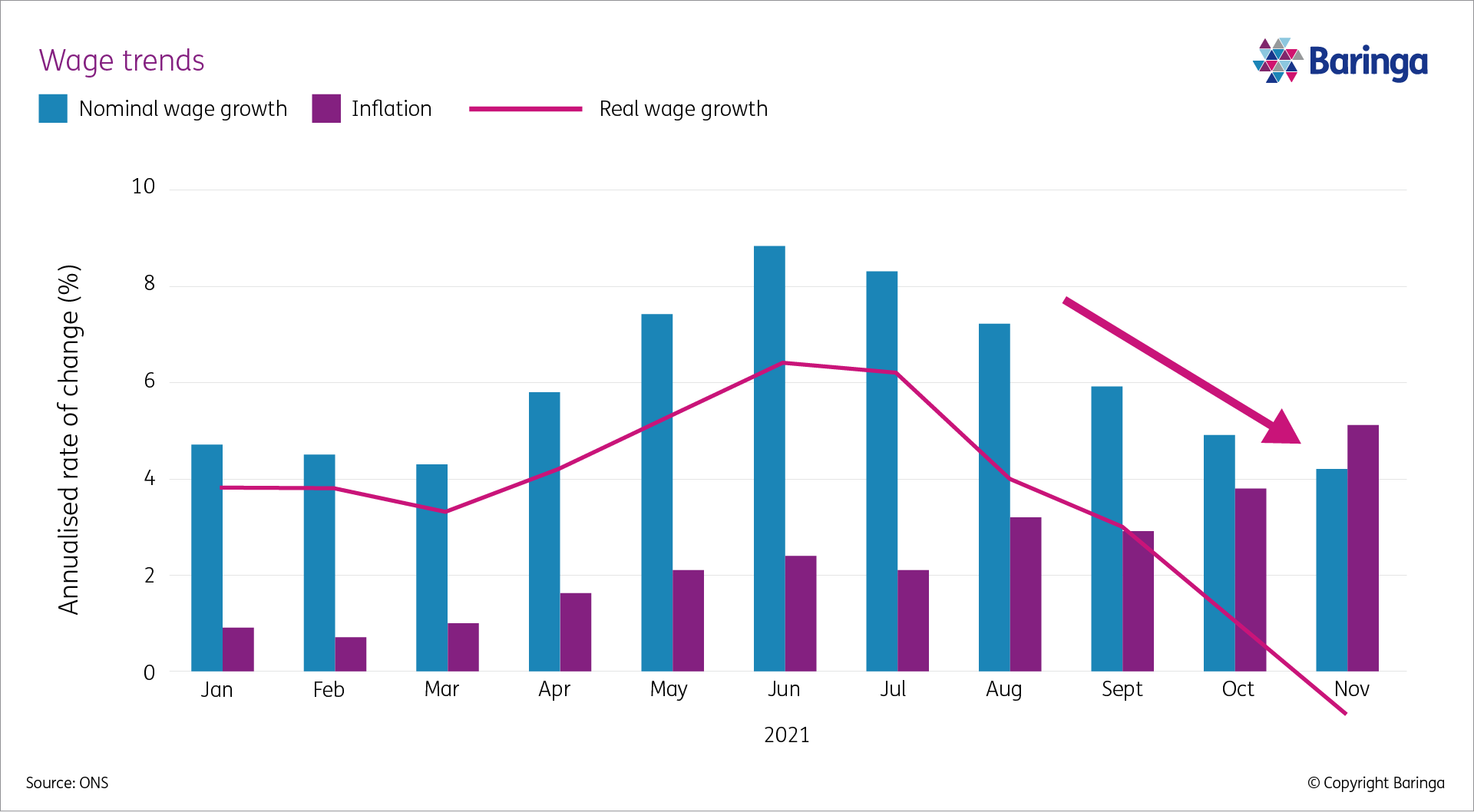 Initially, economists looked positively on rising nominal wages as pent-up demand, supply shortages and new labour mobility restrictions created rapid nominal wage growth in the first three-quarters of 2021.