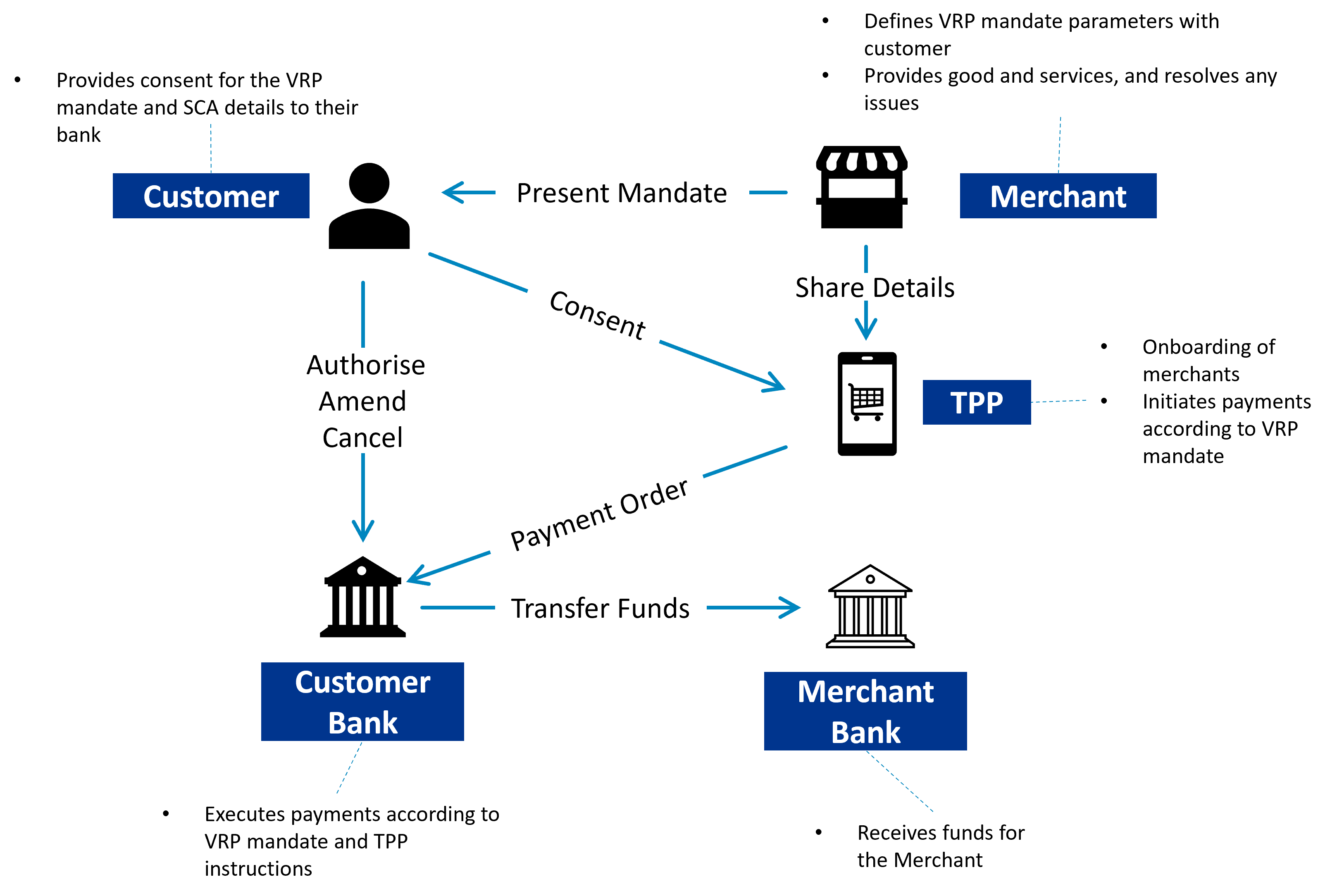 In order for the use of VRPs, especially non-sweeping, to become more prevalent, banks and PSPs need to be clear on the commercial structure of their offering. The first step in this is identifying who the parties are in the ecosystem and what their responsibilities are:
