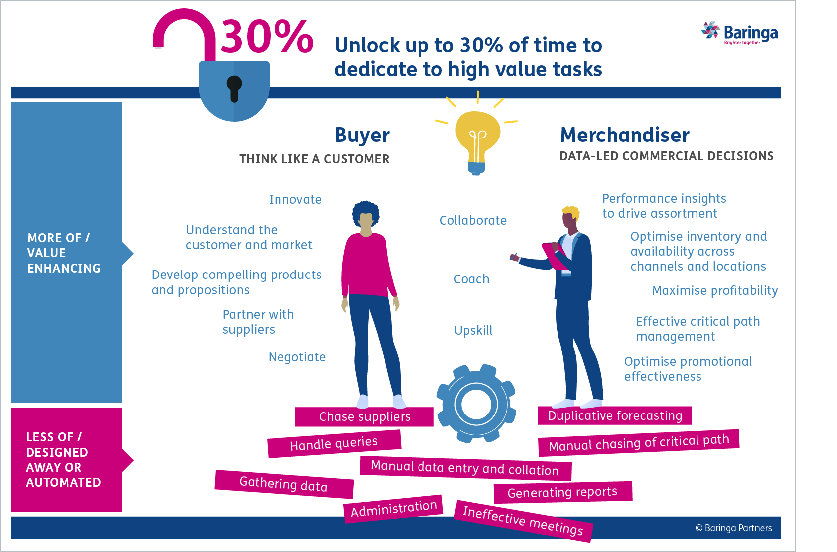 In many retailers, there are typically a large number of ‘no regret’ opportunities: inefficiencies and manual interventions that could be designed away or automated. This isn’t about major technology implementation projects, but rather spotting non value-add work, such as multiple spreadsheets with duplication, double-handling and manual, error-prone data-entry. Looking at the process across categories or brands can reveal a plethora of efficiency gains.